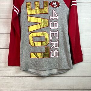 In great condition. Gray/red with gold LOVE 49ERS graphic. Pullover hoodie sweater. Cotton/polyester blend. Refer to pictures for measurements. From smoke-free/pet-free home.
