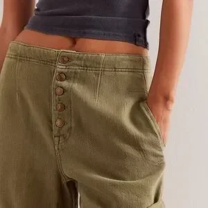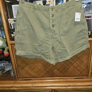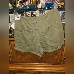 Stylish olive jean shorts. Features button front. Perfect for casual wear.
