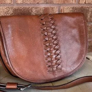 Elegant tan leather crossbody with unique woven design. Ideal for versatile styling. 8x11” with a 22” drop with adjustable strap.