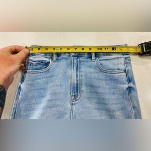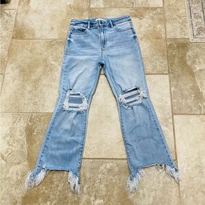 EUC Hidden Los Angeles high-rise jeans, size 27x26 with 11” rise. Features a cropped ankle flare cut, heavy distressing, and dramatic frayed hems. Stretchy stonewashed denim.