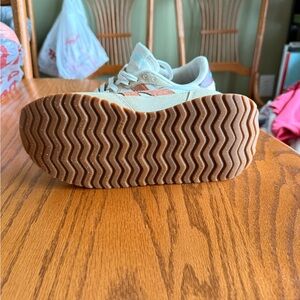 New Balance White and Tan Sneakers with Blue Accents