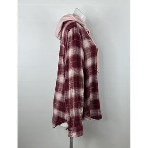 Time and Tru Burgundy & Pink Plaid Flannel Button Up Hoodie Shirt Women's XL
