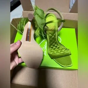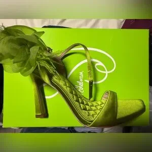 Vibrant lime green heels with a chic floral detail. Strappy design for a stylish look.