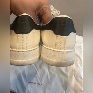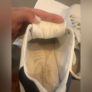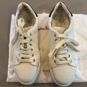 Salvatore Ferragamo White Sneakers Womens size 7 in pre owned condition. There is a stain on one pair (shown in picture). The shoes have normal signs of wear besides the one stain. Comes with dust bag. No box