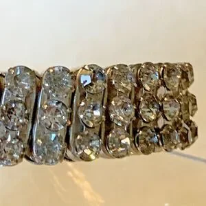 Beautiful vintage rhinestone expansion bracelet marked Made in British Hong Kong. Features three rows of bright clear rhinestones set in silver-tone metal with a comfortable stretch design. Classic mid-century sparkleperfect for collectors, costume jewelry lovers, or adding glam to any outfit.