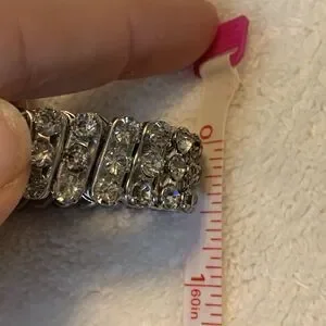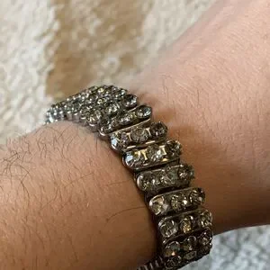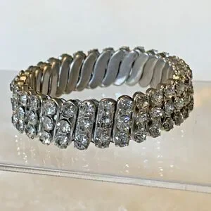 The bracelet stretches to fit comfortably and retains good elasticity. Stones have nice shine and the setting has that distinct vintage Hong Kong craftsmanship known for sturdy, affordable rhinestone pieces from the 1950s1970s.