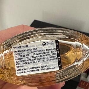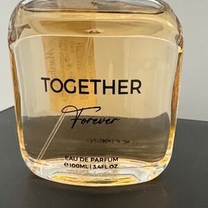 Elegant Together Forever Eau de Parfum. Sleek silver cap with a clear bottle showcasing a warm amber hue. This scent has a warm woodsy smell. The bottle is brand new!