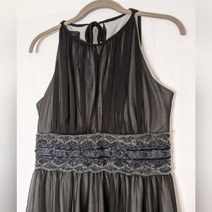 This is a Stunning Dress Barn Collection Women's Fancy Sleeveless Dress with Sheer Black Overlay and Beaded Waist. It is a Size 4. It is a sleeveless halter style with an a-line fit. Fully lined in a silvery gray. Measurements are: bust - 32", waist - 28", length - 41". It is in excellent condition. Please see pics for details.