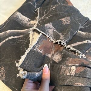 Wide leg pants with a dark camouflage pattern. Features a relaxed fit and side pockets. Worn once and washed once; nothing wrong just didn't like it in me!