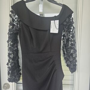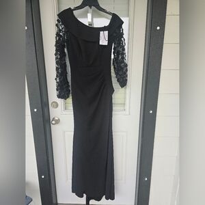 $249 XSCAPE Off-The-Shoulder Floral-Sleeve Gown Sz 6 Black Cocktail Party