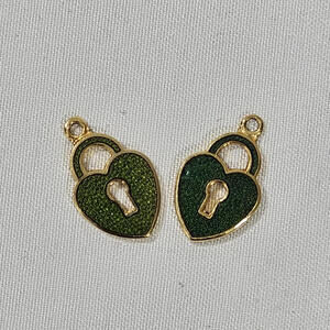 Vintage Enamel Over Gold Tone Pair Of Green Heart Lock Charms Small 1/2 Inch