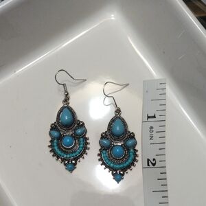 Turquoise and silver. Blue and silver. Chandelier style red and orange. 3 pairs of earrings. No backs. All very beautiful!