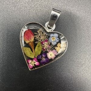 lovely dainty heart pendant of beautiful array of flowers encased in resin in a silver tone setting