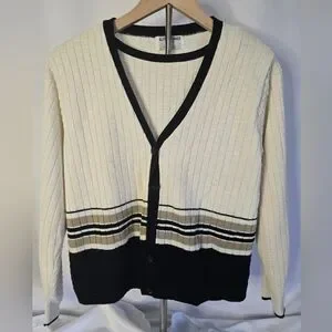 Size Medium – ideal for layering or rocking solo with high-waisted jeans, slacks, or a midi skirt. The neutral tones with contrast stripes make it a standout piece in any vintage lover’s wardrobe.
