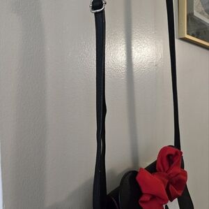 Chic and playful, this black and red Minnie Mouse crossbody bag is perfect for Disney fans. Featuring a bold red bow and iconic Minnie design, it's a stylish accessory for any outing. Minnie Crossbody Bag