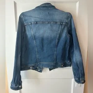 Timeless blue jean jacket with button front. Features dual chest pockets. Ideal for everyday wear.