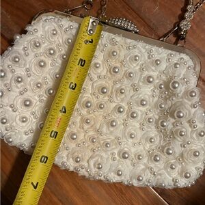 Stunning ivory/white evening bag featuring all-over rosette detailing with pearl beading. Perfect for weddings, proms, quinceañeras, formals, or as a statement evening bag.