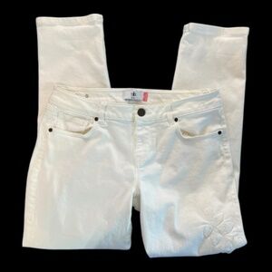 EUC Cabi white slim boyfriend jeans w/ floral appliqué – women’s size 10