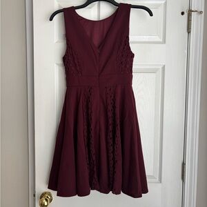 Chic burgundy mini dress with lace panels. Perfect for stylish outings. Armpit to armpit is 17 inches. Shoulder hem to bottom is 35 inches. Material is rayon, polyester, spandex