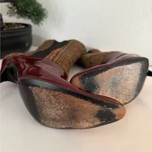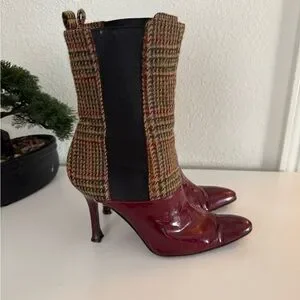 Sophisticated heeled boots with a plaid pattern and glossy burgundy finish. Ideal for a stylish look.