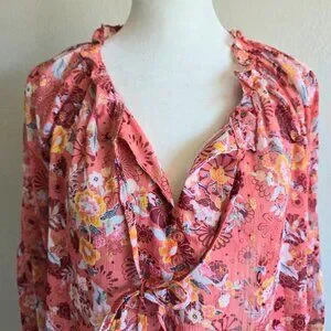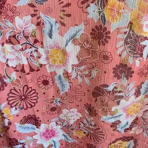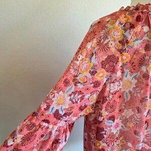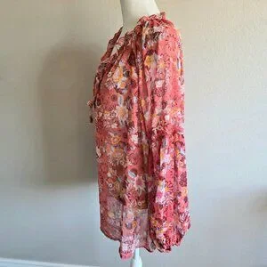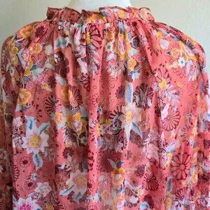 New (with tags) pretty floral semi sheer chiffon blouse - long balloon sleeves - gold metallic sparkle accents - three small buttons at neck with ties - small ruffles at neck - relaxed fit - gathered around neck