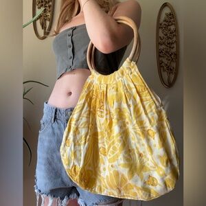 Boho yellow shoulder/hand bag with round bamboo handles and a magnetic closure. Some cute beaded details on the front too! Minor pulling on the back as pictured.