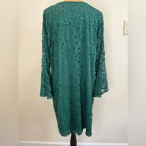 This fun and festive Lane Bryant lace shift dress could be just the thing for your holiday party. Lined, with a darted top for some shaping, this dress also stretches. The sleeves might be the best of all. These sleeves are full at the bottom and cut out on the inner seam, inviting flowing movement. Elegant for evening special events or a holiday wedding, this dress does it all. MSRP $90. Forest green. Size 18-20