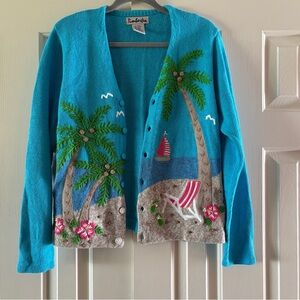 Vintage blue knit novelty cardigan sweater with embroidered beaded ocean beach theme. The brand is Timberlea. It is in great condition and a size medium.