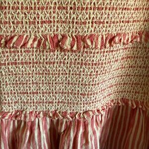 Pink and white striped Love Shack Fancy maxi dress with smocking ,ruffle accents and tie straps.
