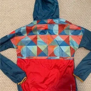 Cotopaxi colorful Teca windbreaker with geometric patterns. Features a hood and front pocket. Water resistant. Women's medium, men's small