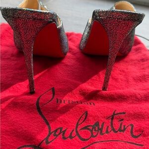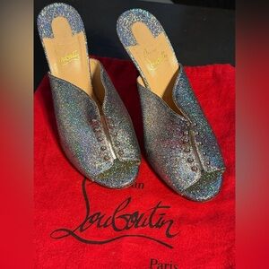 Shimmer with every step with these stunning Christian Louboutin shoes. The Predumule silver iridescent coated glitter slip on pumps features an open toe. Wear on bottom sole shown in photo. No box but comes with the brands red dust bag.