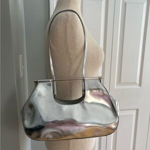 Elegant silver two way vintage bag by Sondra Roberts. May be carried as a top handle/clutch or with a detachable (27.5”) strap that clips on to inside of bag to carry on your shoulder. Interior has one slot pocket and one zippered pocket. Base measures 10” x 3” and 9”high x 13” wide x 3” deep. In good used condition.