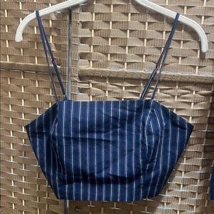 Stylish skirt set with blue and white stripes. Includes a crop top and wrap skirt. Perfect for casual outings.