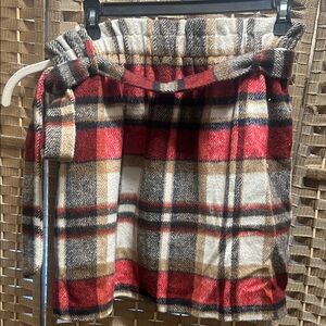 Chic mini skirt with a bold plaid design. Features a stylish wrap and tie detail.