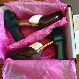 An artful blend of retro and modern. These Chie Mihara Damaho platform heels feature a glossy dark brown patent leather toe, a forest green metallic ankle strap, and a chic bronze detail for a subtle flash of contrast. Designed with a flattering V-cut vamp, self-covered block heel, and a soft leather-lined interior for all-day comfort. Buckle closure at the ankle ensures a secure, elegant fit.