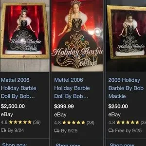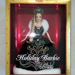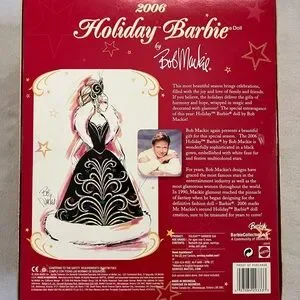 celebrate the season with the elegant 2006 Holiday Barbie Doll by Bob Mackie! dressed in a stunning black gown with colorful accents, this doll is perfect for collectors & holiday enthusiasts, a must-have for any Barbie fan!