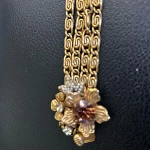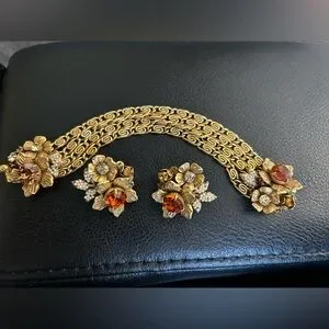 VINTAGE VENDOME AMBER RHINESTONE FLOWER MULTI-CHAIN BRACELET WITH VINTAGE CLIP EARRINGS TO MATCH. SET HAS MINI FAUX PEARLS EMBEDDED IN GOLD TONED FLOWERS. LOCKING CLASPS ON ENDS FOR SECURITY. Very good condition