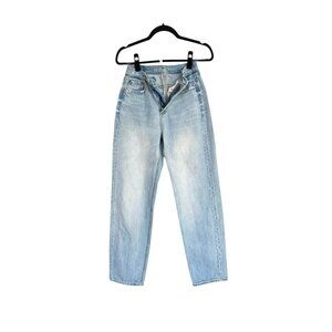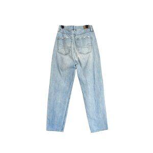 American Eagle Washed Blue Rinse High Waisted Contrast Topstitching Flat Front Distressed Ripped Accents Baggy Straight Leg Jean 90s Inspired Denim Size 2 - Excellent condition.