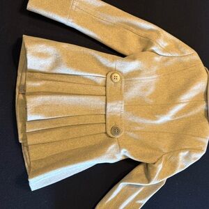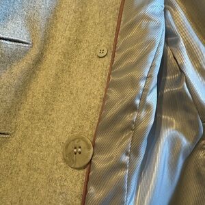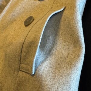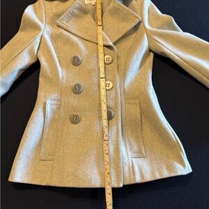Elegant gray peacoat with classic double-breasted style. Features wide lapels and button detailing. Two slit side pockets. I wore this once. Very nice comfortable warm peacoat. It is well made. Sadly, too small for me now at a size 2. Looks like a small spot on the back by the right arm. I didn’t notice it just looking at it. Noticed while taking pictures and measurements. See images for details. No holes or other spots seen. Extra buttons on the inside. Smoke free home.