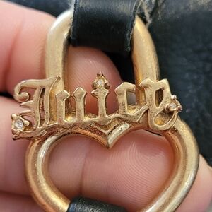 Chic black leather wristlet with gold-tone hardware. Enbellised with three rhinestones in the "Juicy" detail. Features magnetic closure. Ideal for versatile styling.