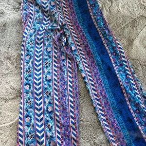 Vibrant wide-leg pants with a colorful pattern. Features shades of blue, pink, and purple.