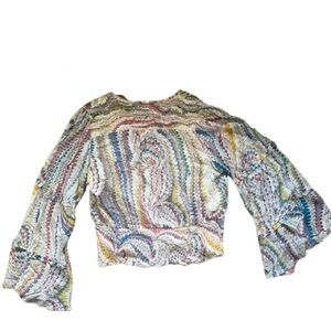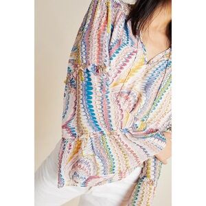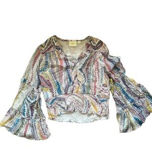 Anthropologie Maeve Jessa Peasant Blouse. Size: medium. Fun and feminine at once, this classic peasant blouse features smocked shoulders and sweeping bell sleeves for a retro '70s feel.