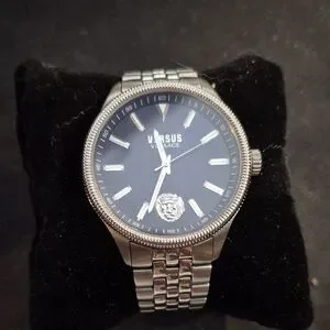 Stylish Versus Versace watch with a silver band and XL blue dial (45mm). Features iconic lion emblem. Perfect for modern elegance.