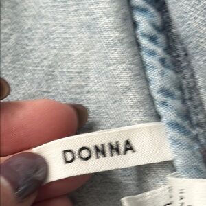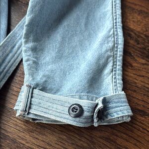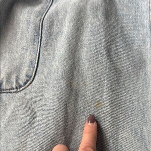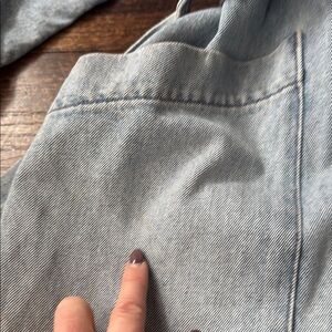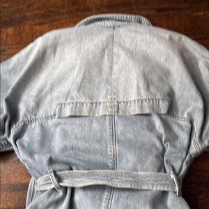 this is a great stylish denim trench jacket. Distressed ham at the bottom. This is new condition. There are some marks on the front of the jacket. Please see photos for detail details. Stylish and versatile light blue denim jacket for women. Perfect for casual outings and layering.