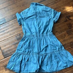 Chic light blue denim shirt. Features button-up front and classic collar. Perfect for casual wear.