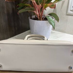 Dome-shaped satchel with a snakeskin-embossed leather exterior and white accents.