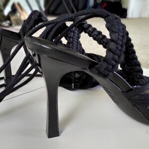 Chic black sandals with intricate braided design. Ideal for stylish outings.