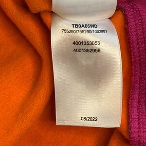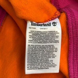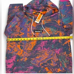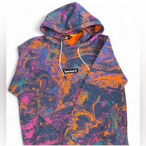 NWT Timberland All Over Print Fleece Pullover Hoodie in the rare Summer Rock Print Multi colorway. Super vibrant marbled pattern with orange, purple, teal, and charcoal tones. Soft fleece interior, front kangaroo pocket, adjustable drawstring hood, and ribbed cuffs/hem in contrasting pink.
