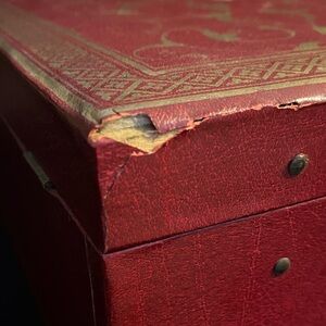 Store your treasures in this elegant red jewelry box. Its intricate design adds a touch of sophistication to any collection. 1960’s time frame. Has some flaws. Please see all pictures