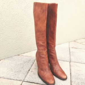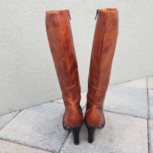 100% Real Leather Tall Boots with side zipper. Unique threading detail. Approx. 3" heel. Treaded rubber soles keep you from slipping in wet or winter weather. In good condition! Has signs of typical wear. Shoe polish buffing could make these look brand new.